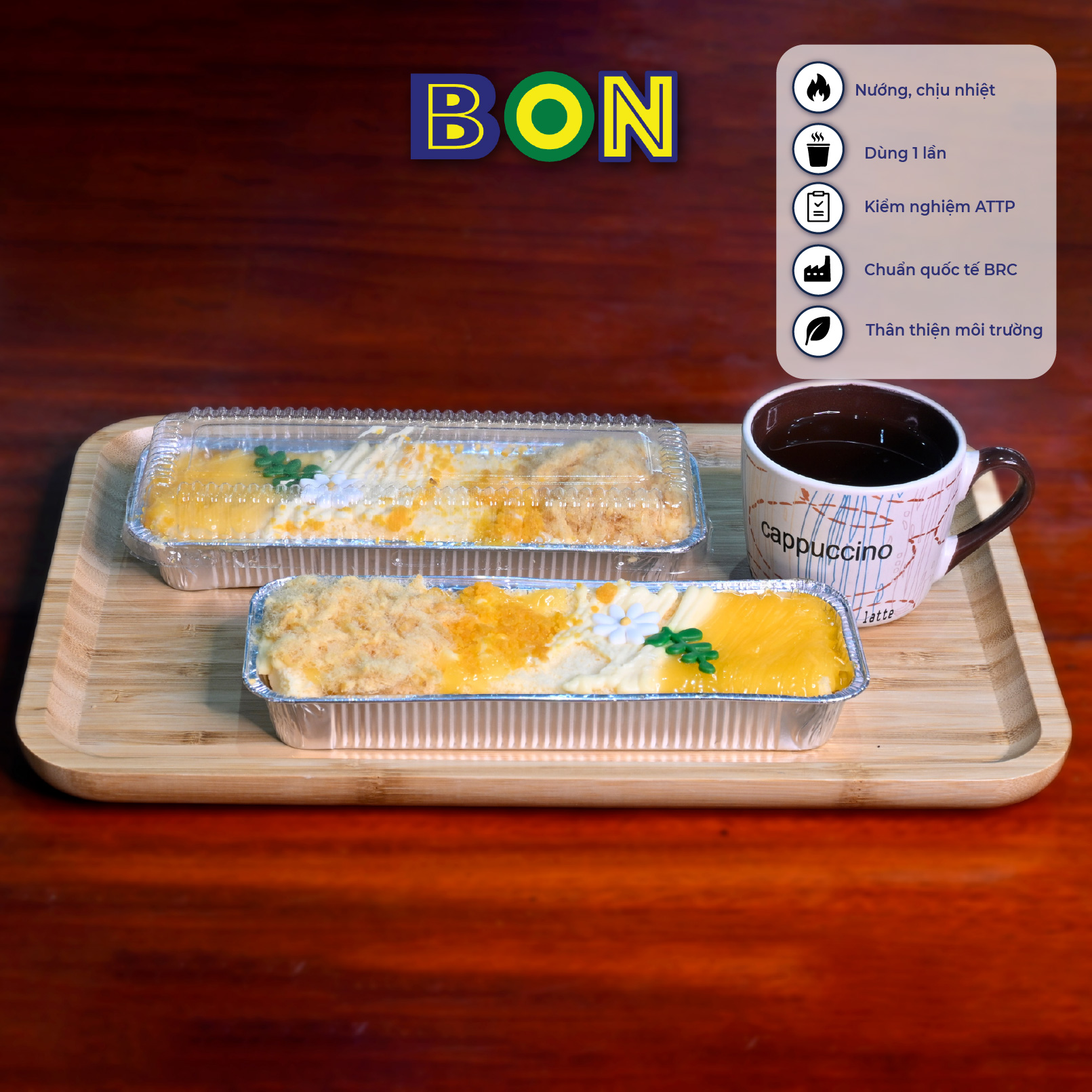 - Chén nhôm nướng BON C5 với dung tích 320ml là lựa chọn lý tưởng cho những chiếc bánh bông lan, bánh mì bơ tỏi, bánh flan hay pudding, tiramisu.