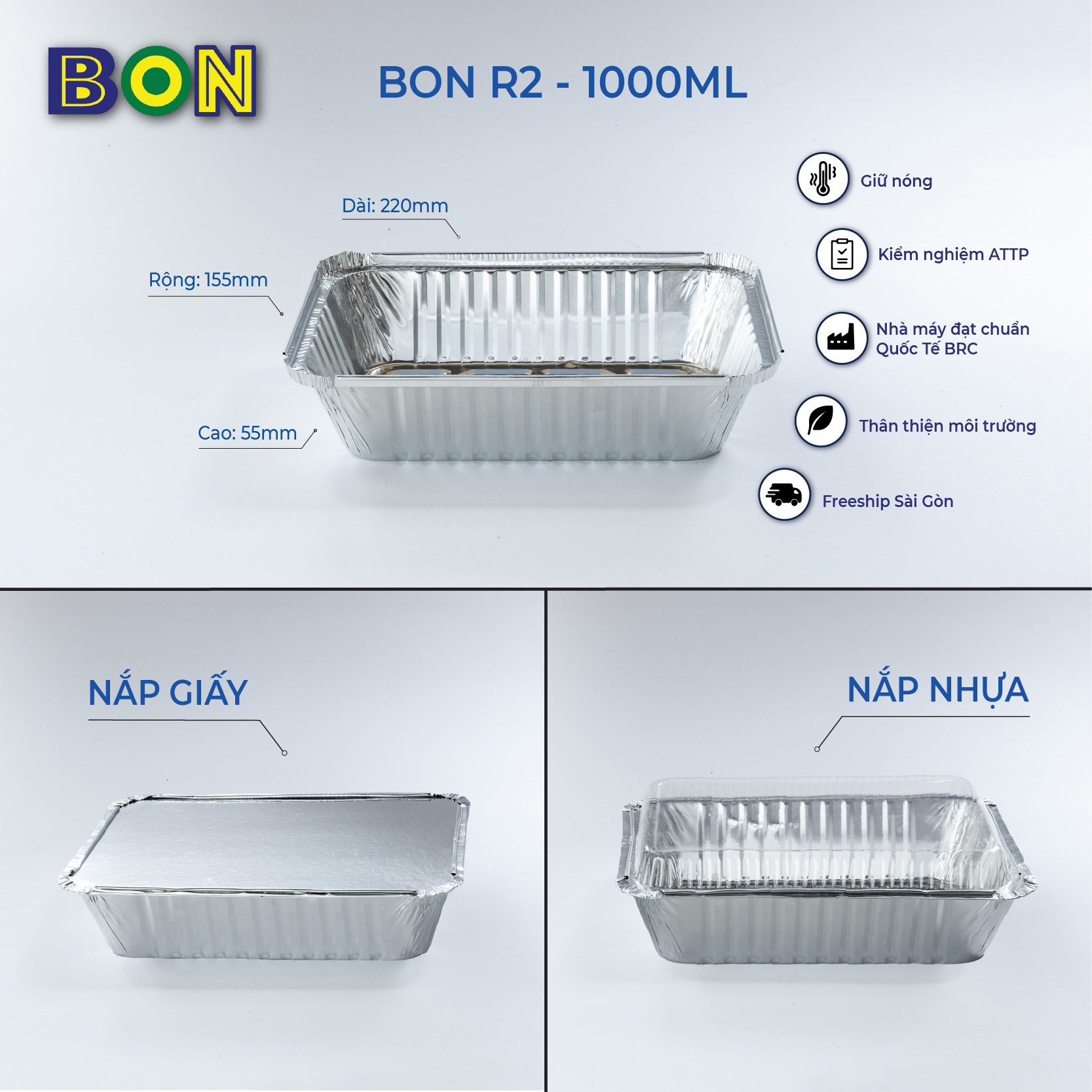 - Hộp Nhôm Take Away BON R2 – 1000ml, bạn đồng hành đáng tin cậy cho các món hải sản như ốc, nghêu, tôm, mực, cá…Thực khách sẽ được thưởng thức hải sản với trọn vẹn sự ấm nóng và tươi ngon nhờ tính năng giữ nhiệt đến 2h đặc trưng của BON R2.