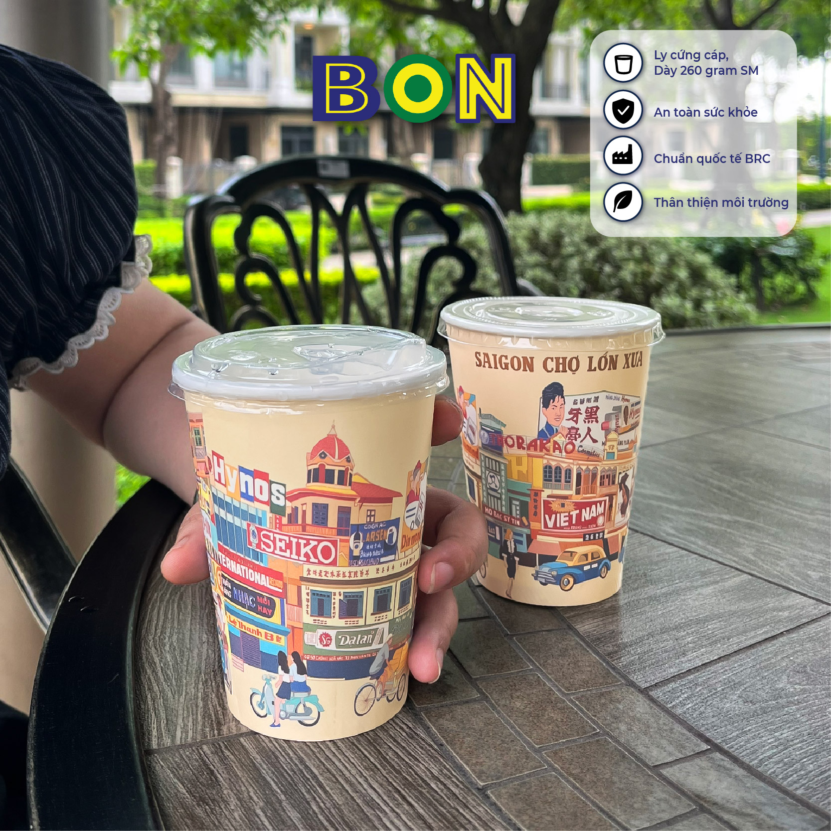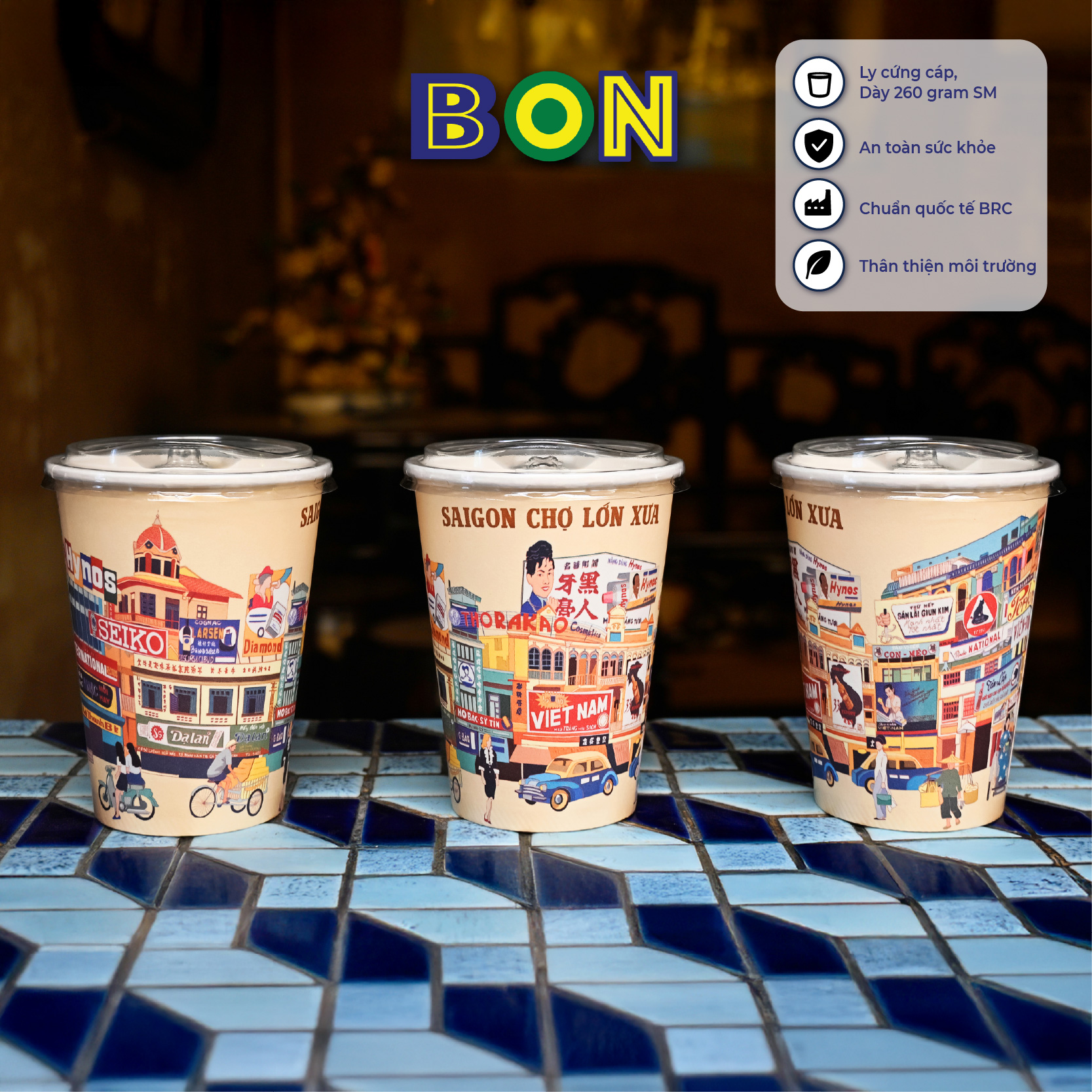 - Ly giấy in tranh - Sài Gòn Chợ Lớn 360ml sở hữu thiết kế nổi bật tái hiện lại đời sống thường ngày và các địa danh ở khu vực Chợ Lớn ngày xưa, với họa tiết in sắc nét, tạo điểm nhấn thẩm mỹ, và giúp ly nước trở nên hấp dẫn hơn.